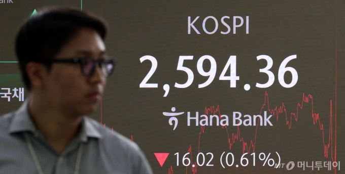 [서울=뉴시스] 김선웅 기자 = 코스피가 전 거래일(2610.38)보다 16.02포인트(0.61%) 내린 2594.36에 거래를 종료했다. 8일 오후 서울 중구 하나은행 본점 딜링룸에서 딜러가 업무를 수행하고 있다.